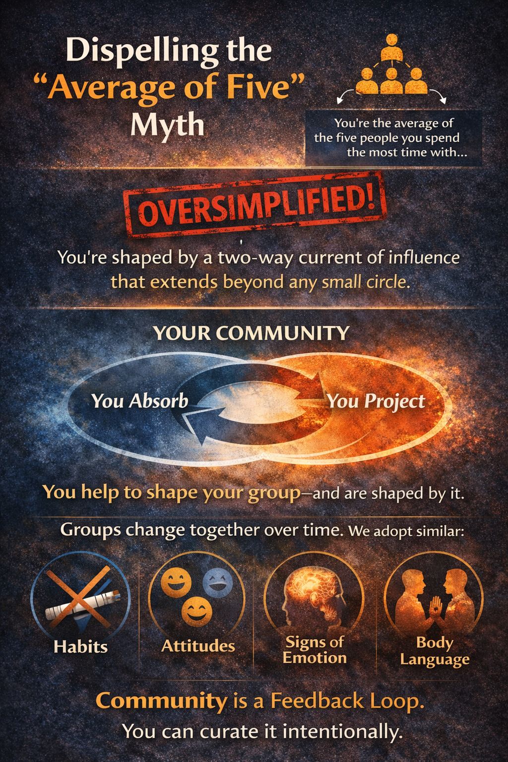 Unlike the old “average of five” idea, we’re not passive reflections of our peers. We’re active participants in the ecosystem that forms around us. The more intentional you are about curating and contributing to your community, the more aligned your environment becomes with your goals and values.